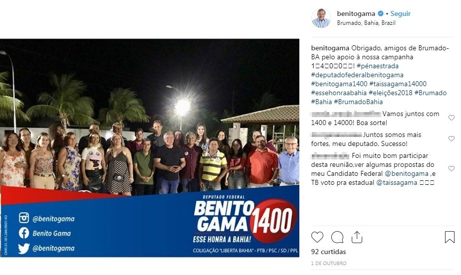 Na rede social Instagram, o parlamentar postou uma foto na cidade com a legenda: “Obrigado, amigos de Brumado-BA pelo apoio à nossa campanha 1400”. “Foi muito bom participar desta reunião,ver algumas propostas do meu Candidato Federal @benitogama ,e TB voto pra estadual @taissagama”, comentou um internauta.